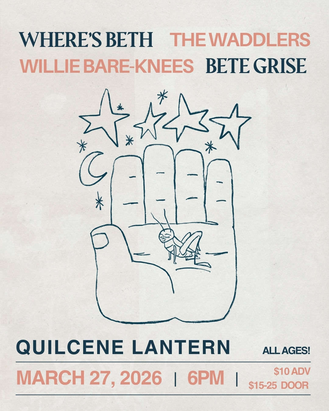 The Quilcene Lantern is proud to present Where's Beth, Bete Grise, The Waddlers, and Willie Bare-Knees!